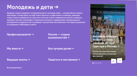 Будущее страны определят сегодняшние дети и молодые люди — инициативные, широко мыслящие, готовые брать на себя ответственность и действовать в команде, умеющие ставить цели и добиваться их. Для этого в России строят современные школы и кампусы, проводят научные олимпиады и творческие конкурсы, поддерживают международное молодежное сотрудничество и развивают лучшие практики обучения. Эти задачи реализуют по нацпроекту «Молодежь и дети».